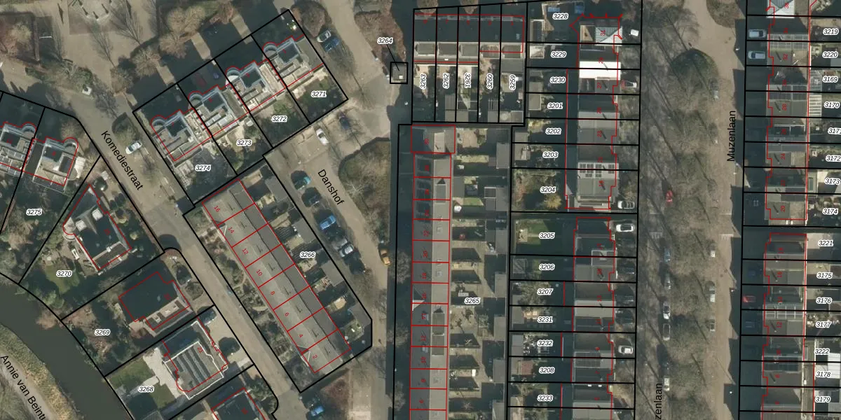 Het perceel waarop Danshof 24 staat heeft een oppervlakte van 2190 m². Dit is een zeer groot perceel. De perceeloppervlakte wordt geregistreerd door het Kadaster. Gedetailleerde informatie over de maten van dit perceel kunt u vinden in het rapport Kadastrale kaart met maatvoering van Danshof 24.