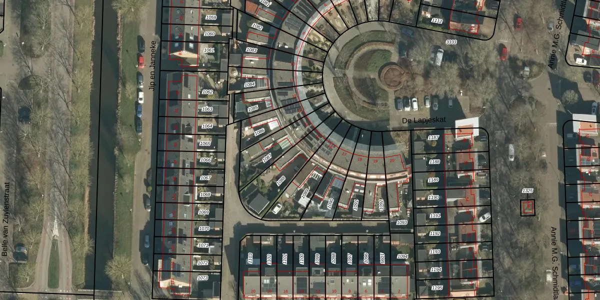 Het perceel waarop De Lapjeskat 15 staat heeft een oppervlakte van 335 m². Dit is een groot perceel. De perceeloppervlakte wordt geregistreerd door het Kadaster. Gedetailleerde informatie over de maten van dit perceel kunt u vinden in het rapport Kadastrale kaart met maatvoering van De Lapjeskat 15.