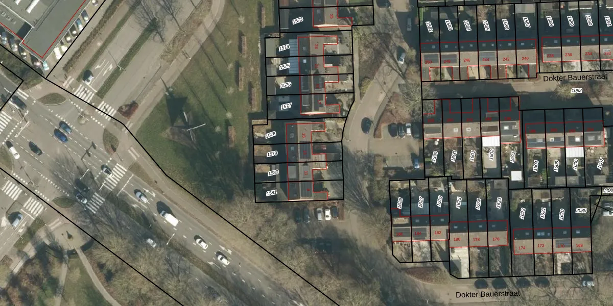 Dokter Bauerstraat 13 is gelegen op kadastraal perceel GRC00E1579. Deze kadastrale aanduiding is uniek en wordt gebruikt door het Kadaster om eigendomsrechten en andere zakelijke rechten vast te leggen. Het perceel maakt onderdeel uit van de kadastrale gemeente Gorinchem.