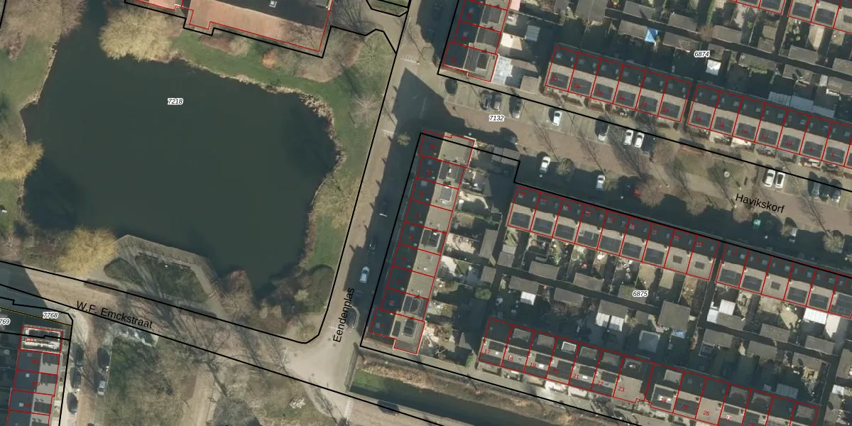 Het perceel waarop Eendenplas 12 staat heeft een oppervlakte van 6555 m². Dit is een zeer groot perceel. De perceeloppervlakte wordt geregistreerd door het Kadaster. Gedetailleerde informatie over de maten van dit perceel kunt u vinden in het rapport Kadastrale kaart met maatvoering van Eendenplas 12.