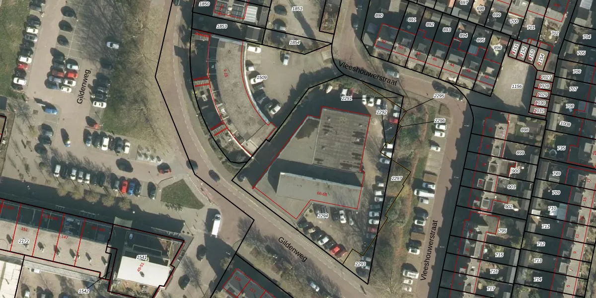 Het perceel waarop Gildenweg 66-26 staat heeft een oppervlakte van 2114 m². Dit is een zeer groot perceel. De perceeloppervlakte wordt geregistreerd door het Kadaster. Gedetailleerde informatie over de maten van dit perceel kunt u vinden in het rapport Kadastrale kaart met maatvoering van Gildenweg 66-26.
