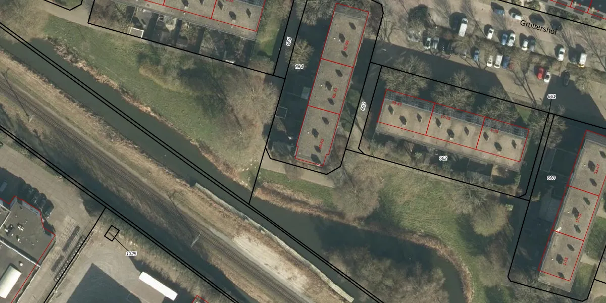 Het perceel waarop Gruttershof 49 staat heeft een oppervlakte van 1511 m². Dit is een zeer groot perceel. De perceeloppervlakte wordt geregistreerd door het Kadaster. Gedetailleerde informatie over de maten van dit perceel kunt u vinden in het rapport Kadastrale kaart met maatvoering van Gruttershof 49.