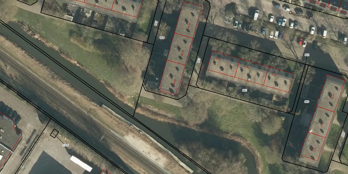 Het perceel waarop Gruttershof 57 staat heeft een oppervlakte van 1511 m². Dit is een zeer groot perceel. De perceeloppervlakte wordt geregistreerd door het Kadaster. Gedetailleerde informatie over de maten van dit perceel kunt u vinden in het rapport Kadastrale kaart met maatvoering van Gruttershof 57.