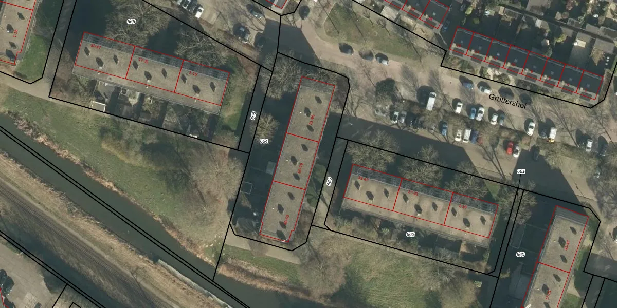 Gruttershof 77 is gelegen op kadastraal perceel GRC00E664. Deze kadastrale aanduiding is uniek en wordt gebruikt door het Kadaster om eigendomsrechten en andere zakelijke rechten vast te leggen. Het perceel maakt onderdeel uit van de kadastrale gemeente Gorinchem.