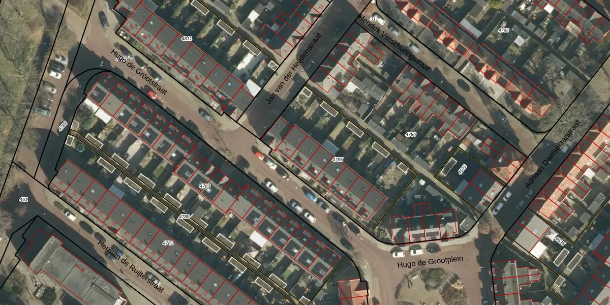 Hugo de Grootstraat 38 is gelegen op kadastraal perceel GRC00F4785. Deze kadastrale aanduiding is uniek en wordt gebruikt door het Kadaster om eigendomsrechten en andere zakelijke rechten vast te leggen. Het perceel maakt onderdeel uit van de kadastrale gemeente Gorinchem.