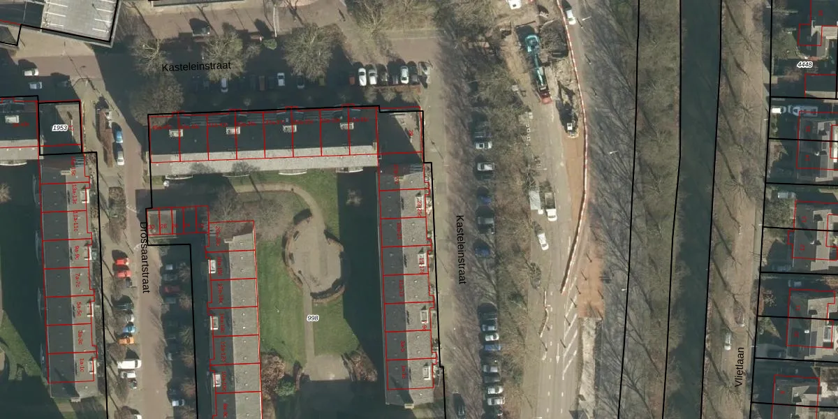 Het perceel waarop Kasteleinstraat 23 staat heeft een oppervlakte van 6211 m². Dit is een zeer groot perceel. De perceeloppervlakte wordt geregistreerd door het Kadaster. Gedetailleerde informatie over de maten van dit perceel kunt u vinden in het rapport Kadastrale kaart met maatvoering van Kasteleinstraat 23.