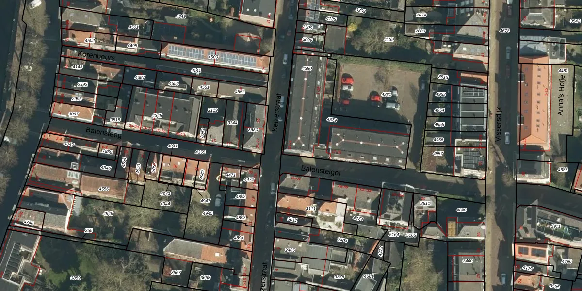 Het perceel waarop Keizerstraat 18 staat heeft een oppervlakte van 965 m². Dit is een groot perceel. De perceeloppervlakte wordt geregistreerd door het Kadaster. Gedetailleerde informatie over de maten van dit perceel kunt u vinden in het rapport Kadastrale kaart met maatvoering van Keizerstraat 18.