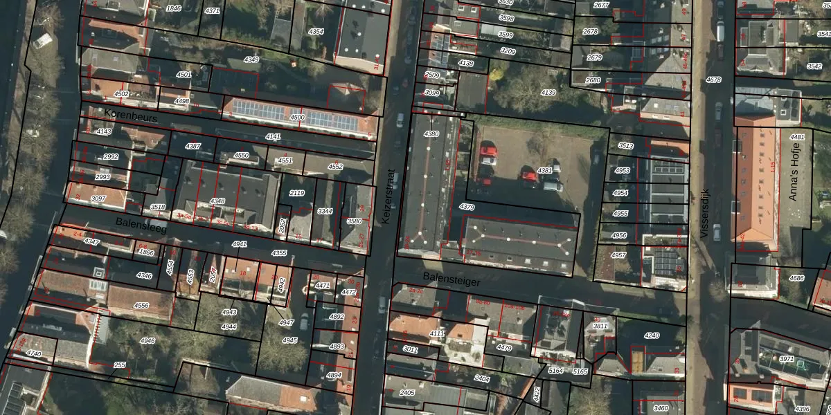 Het perceel waarop Keizerstraat 20 staat heeft een oppervlakte van 965 m². Dit is een groot perceel. De perceeloppervlakte wordt geregistreerd door het Kadaster. Gedetailleerde informatie over de maten van dit perceel kunt u vinden in het rapport Kadastrale kaart met maatvoering van Keizerstraat 20.