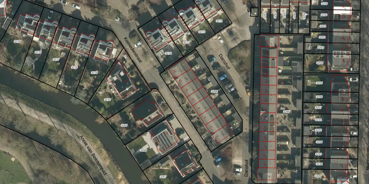 Komediestraat 12 is gelegen op kadastraal perceel GRC00F3266. Deze kadastrale aanduiding is uniek en wordt gebruikt door het Kadaster om eigendomsrechten en andere zakelijke rechten vast te leggen. Het perceel maakt onderdeel uit van de kadastrale gemeente Gorinchem.
