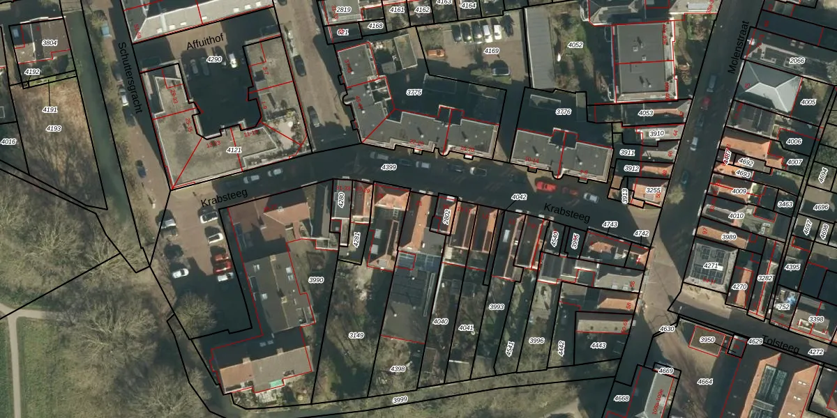 Het perceel waarop Krabsteeg 21 staat heeft een oppervlakte van 490 m². Dit is een groot perceel. De perceeloppervlakte wordt geregistreerd door het Kadaster. Gedetailleerde informatie over de maten van dit perceel kunt u vinden in het rapport Kadastrale kaart met maatvoering van Krabsteeg 21.