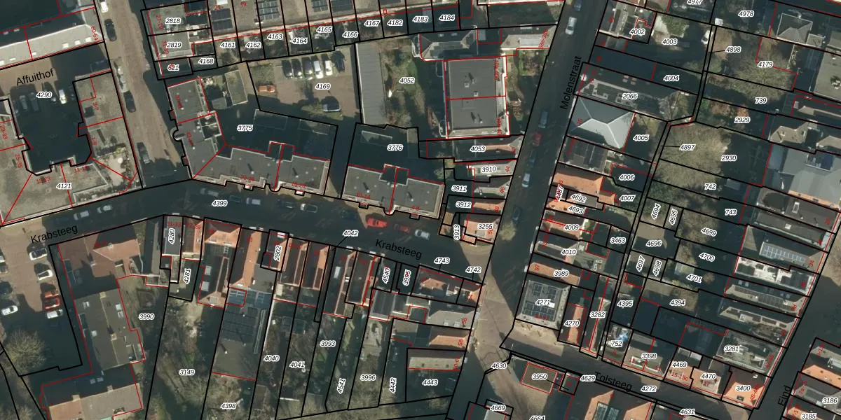 Het perceel waarop Krabsteeg 4 staat heeft een oppervlakte van 415 m². Dit is een groot perceel. De perceeloppervlakte wordt geregistreerd door het Kadaster. Gedetailleerde informatie over de maten van dit perceel kunt u vinden in het rapport Kadastrale kaart met maatvoering van Krabsteeg 4.