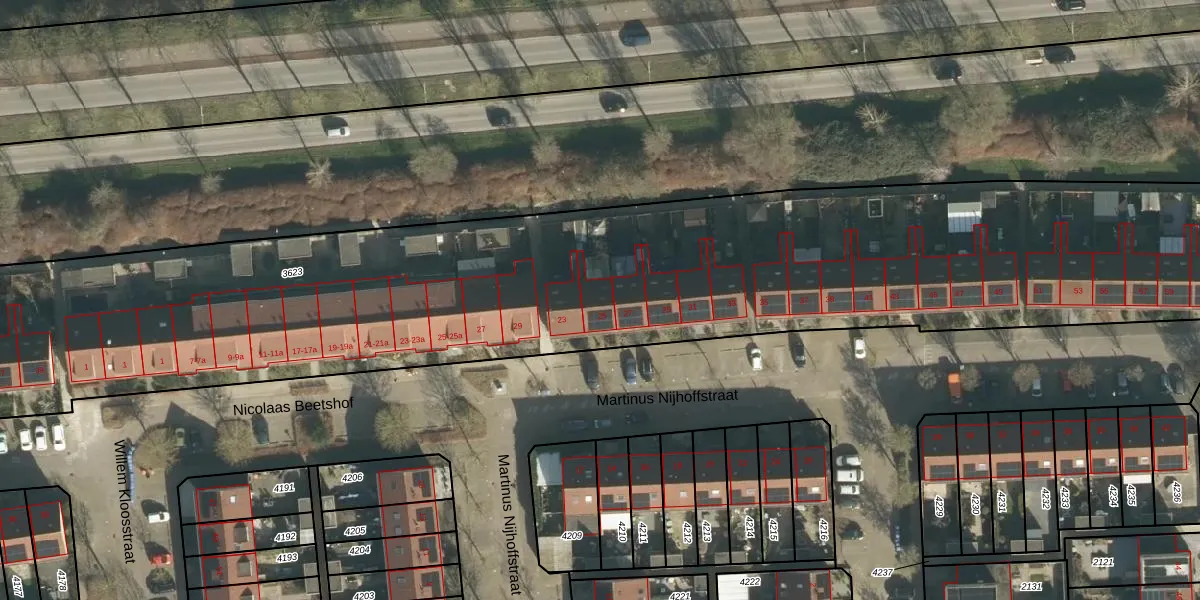Het perceel waarop Martinus Nijhoffstraat 25 staat heeft een oppervlakte van 7510 m². Dit is een zeer groot perceel. De perceeloppervlakte wordt geregistreerd door het Kadaster. Gedetailleerde informatie over de maten van dit perceel kunt u vinden in het rapport Kadastrale kaart met maatvoering van Martinus Nijhoffstraat 25.
