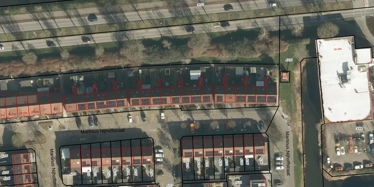 Het perceel waarop Martinus Nijhoffstraat 45 staat heeft een oppervlakte van 7510 m². Dit is een zeer groot perceel. De perceeloppervlakte wordt geregistreerd door het Kadaster. Gedetailleerde informatie over de maten van dit perceel kunt u vinden in het rapport Kadastrale kaart met maatvoering van Martinus Nijhoffstraat 45.