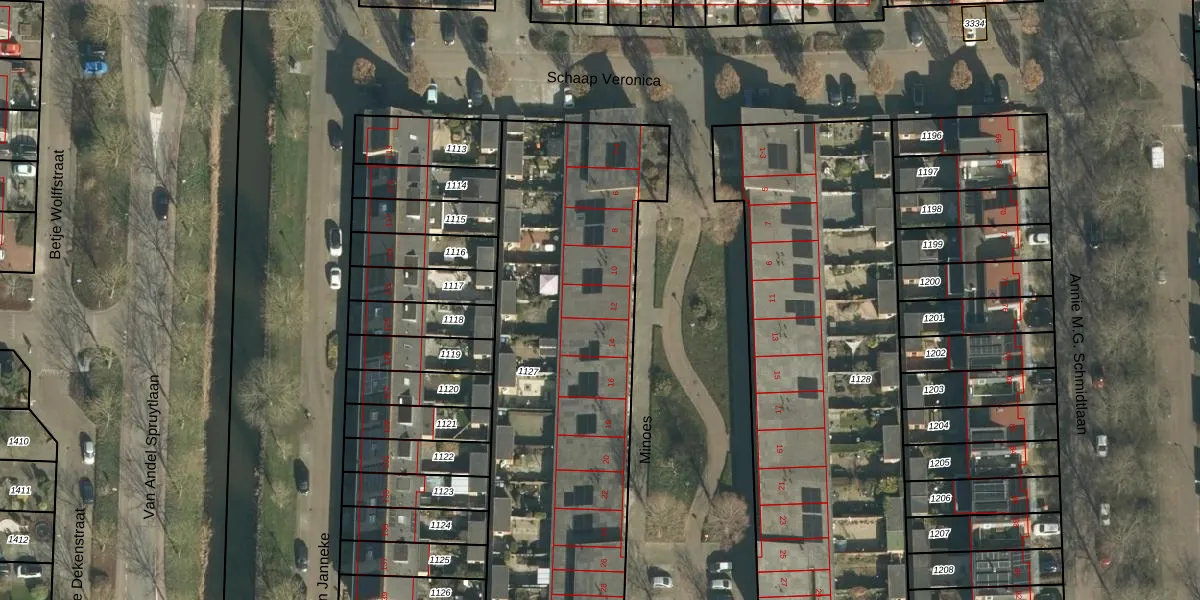Het perceel waarop Minoes 12 staat heeft een oppervlakte van 2014 m². Dit is een zeer groot perceel. De perceeloppervlakte wordt geregistreerd door het Kadaster. Gedetailleerde informatie over de maten van dit perceel kunt u vinden in het rapport Kadastrale kaart met maatvoering van Minoes 12.