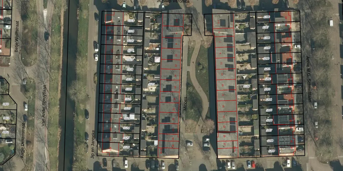 Het perceel waarop Minoes 16 staat heeft een oppervlakte van 2014 m². Dit is een zeer groot perceel. De perceeloppervlakte wordt geregistreerd door het Kadaster. Gedetailleerde informatie over de maten van dit perceel kunt u vinden in het rapport Kadastrale kaart met maatvoering van Minoes 16.