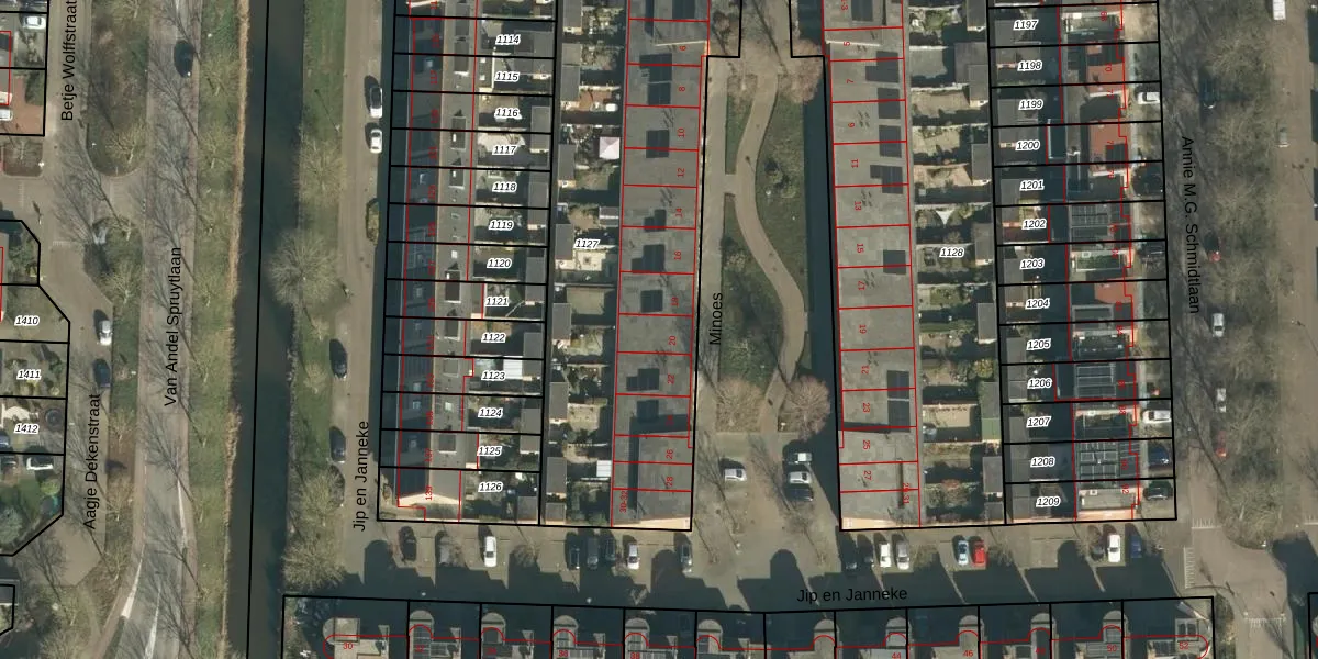 Het perceel waarop Minoes 20 staat heeft een oppervlakte van 2014 m². Dit is een zeer groot perceel. De perceeloppervlakte wordt geregistreerd door het Kadaster. Gedetailleerde informatie over de maten van dit perceel kunt u vinden in het rapport Kadastrale kaart met maatvoering van Minoes 20.