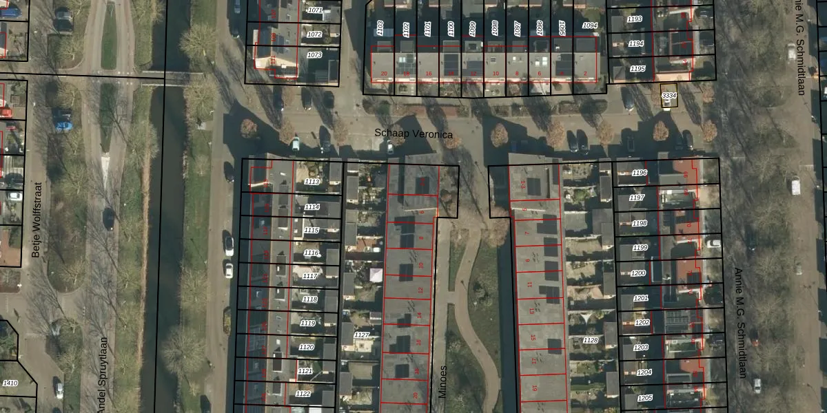 Het perceel waarop Minoes 6 staat heeft een oppervlakte van 2014 m². Dit is een zeer groot perceel. De perceeloppervlakte wordt geregistreerd door het Kadaster. Gedetailleerde informatie over de maten van dit perceel kunt u vinden in het rapport Kadastrale kaart met maatvoering van Minoes 6.