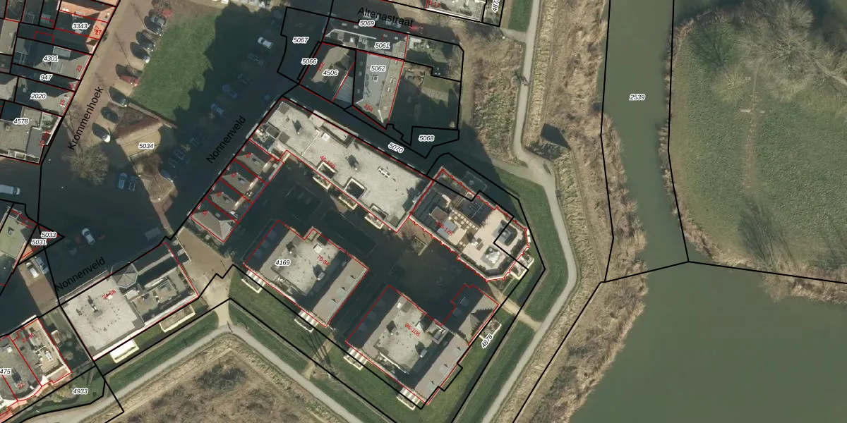 Het perceel waarop Nonnenveld 112 staat heeft een oppervlakte van 3694 m². Dit is een zeer groot perceel. De perceeloppervlakte wordt geregistreerd door het Kadaster. Gedetailleerde informatie over de maten van dit perceel kunt u vinden in het rapport Kadastrale kaart met maatvoering van Nonnenveld 112.