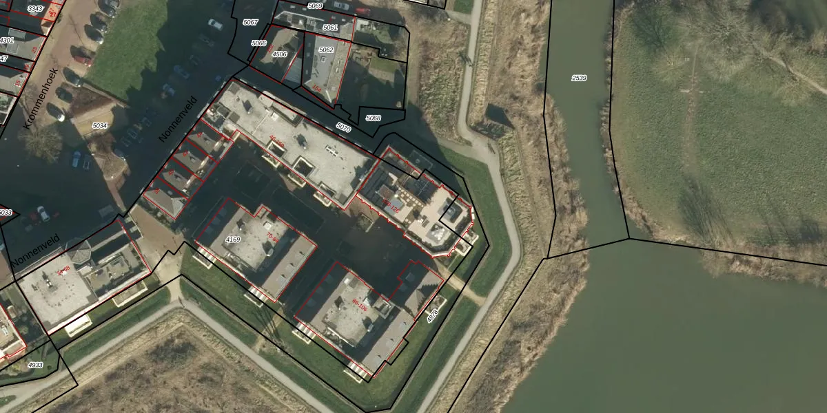 Het perceel waarop Nonnenveld 126 staat heeft een oppervlakte van 3694 m². Dit is een zeer groot perceel. De perceeloppervlakte wordt geregistreerd door het Kadaster. Gedetailleerde informatie over de maten van dit perceel kunt u vinden in het rapport Kadastrale kaart met maatvoering van Nonnenveld 126.