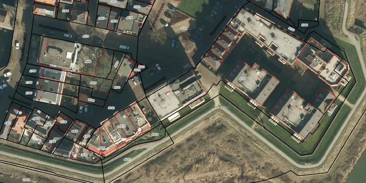 Het perceel waarop Nonnenveld 66 staat heeft een oppervlakte van 3694 m². Dit is een zeer groot perceel. De perceeloppervlakte wordt geregistreerd door het Kadaster. Gedetailleerde informatie over de maten van dit perceel kunt u vinden in het rapport Kadastrale kaart met maatvoering van Nonnenveld 66.