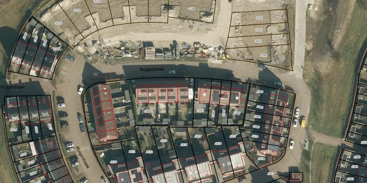 Het perceel waarop Ruigenhoek 25 staat heeft een oppervlakte van 1748 m². Dit is een zeer groot perceel. De perceeloppervlakte wordt geregistreerd door het Kadaster. Gedetailleerde informatie over de maten van dit perceel kunt u vinden in het rapport Kadastrale kaart met maatvoering van Ruigenhoek 25.