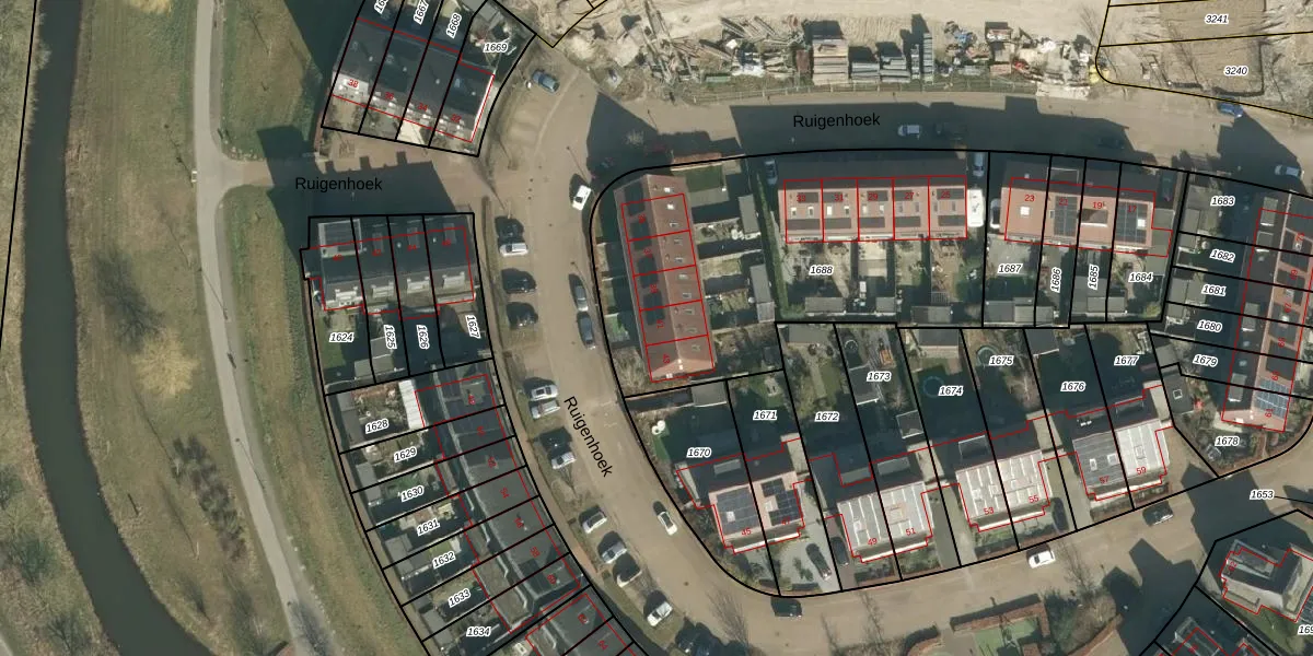 Het perceel waarop Ruigenhoek 41 staat heeft een oppervlakte van 1748 m². Dit is een zeer groot perceel. De perceeloppervlakte wordt geregistreerd door het Kadaster. Gedetailleerde informatie over de maten van dit perceel kunt u vinden in het rapport Kadastrale kaart met maatvoering van Ruigenhoek 41.