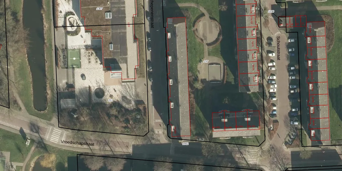 Het perceel waarop Schepenenstraat 16 staat heeft een oppervlakte van 5675 m². Dit is een zeer groot perceel. De perceeloppervlakte wordt geregistreerd door het Kadaster. Gedetailleerde informatie over de maten van dit perceel kunt u vinden in het rapport Kadastrale kaart met maatvoering van Schepenenstraat 16.