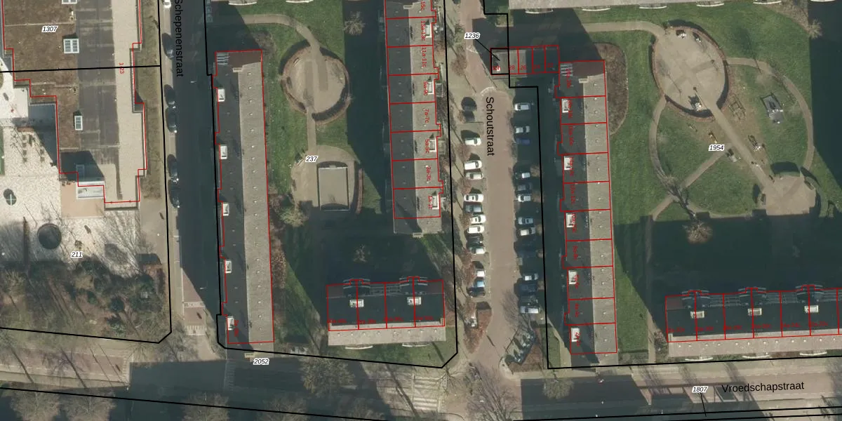 Het perceel waarop Schoutstraat 1-c staat heeft een oppervlakte van 5675 m². Dit is een zeer groot perceel. De perceeloppervlakte wordt geregistreerd door het Kadaster. Gedetailleerde informatie over de maten van dit perceel kunt u vinden in het rapport Kadastrale kaart met maatvoering van Schoutstraat 1-c.