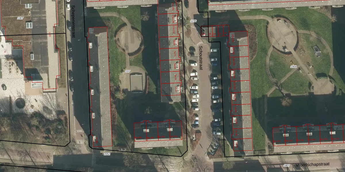 Het perceel waarop Schoutstraat 1-a staat heeft een oppervlakte van 5675 m². Dit is een zeer groot perceel. De perceeloppervlakte wordt geregistreerd door het Kadaster. Gedetailleerde informatie over de maten van dit perceel kunt u vinden in het rapport Kadastrale kaart met maatvoering van Schoutstraat 1-a.