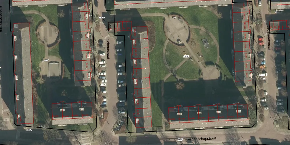 Het perceel waarop Schoutstraat 12-b staat heeft een oppervlakte van 9090 m². Dit is een zeer groot perceel. De perceeloppervlakte wordt geregistreerd door het Kadaster. Gedetailleerde informatie over de maten van dit perceel kunt u vinden in het rapport Kadastrale kaart met maatvoering van Schoutstraat 12-b.