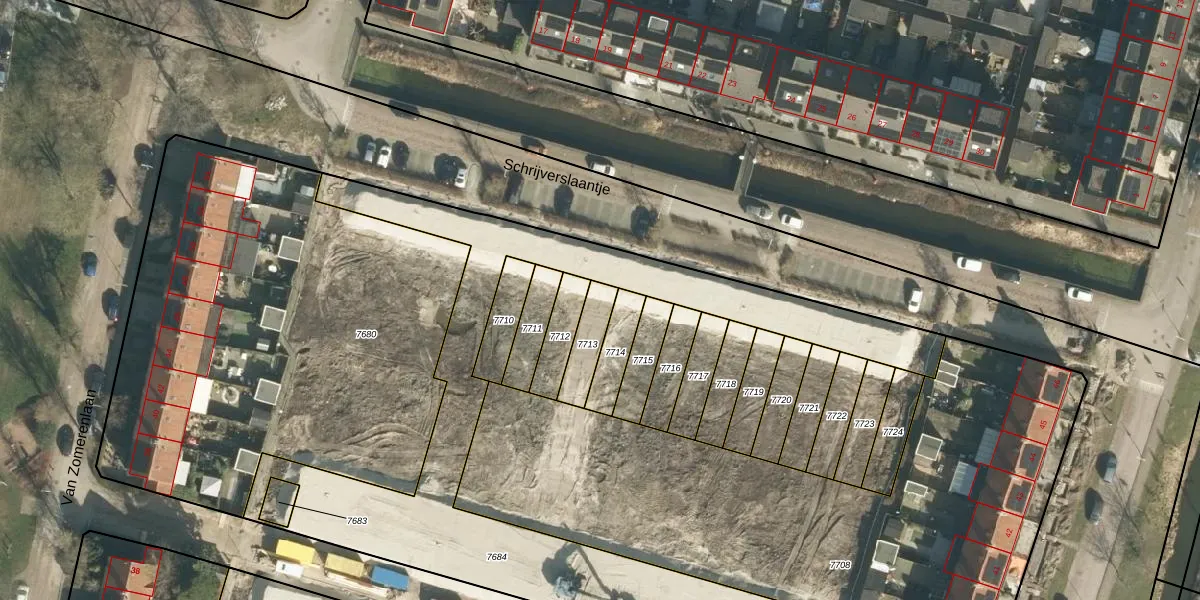 Het perceel waarop Schrijverslaantje 12 staat heeft een oppervlakte van 100 m². Dit is een middelgroot perceel. De perceeloppervlakte wordt geregistreerd door het Kadaster. Gedetailleerde informatie over de maten van dit perceel kunt u vinden in het rapport Kadastrale kaart met maatvoering van Schrijverslaantje 12.