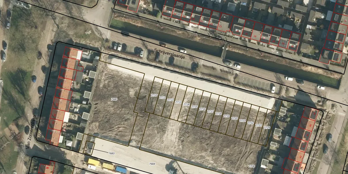 Schrijverslaantje 13 is gelegen op kadastraal perceel GRC00A7712. Deze kadastrale aanduiding is uniek en wordt gebruikt door het Kadaster om eigendomsrechten en andere zakelijke rechten vast te leggen. Het perceel maakt onderdeel uit van de kadastrale gemeente Gorinchem.