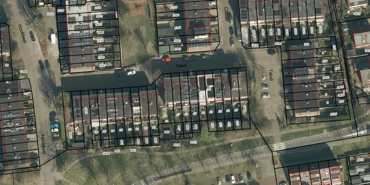 Het perceel waarop Talud 28 staat heeft een oppervlakte van 122 m². Dit is een middelgroot perceel. De perceeloppervlakte wordt geregistreerd door het Kadaster. Gedetailleerde informatie over de maten van dit perceel kunt u vinden in het rapport Kadastrale kaart met maatvoering van Talud 28.