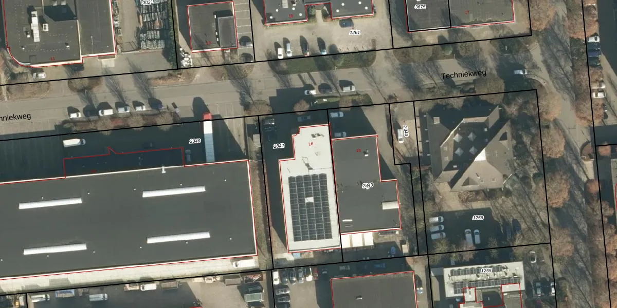 Het perceel waarop Techniekweg 16 staat heeft een oppervlakte van 1116 m². Dit is een zeer groot perceel. De perceeloppervlakte wordt geregistreerd door het Kadaster. Gedetailleerde informatie over de maten van dit perceel kunt u vinden in het rapport Kadastrale kaart met maatvoering van Techniekweg 16.
