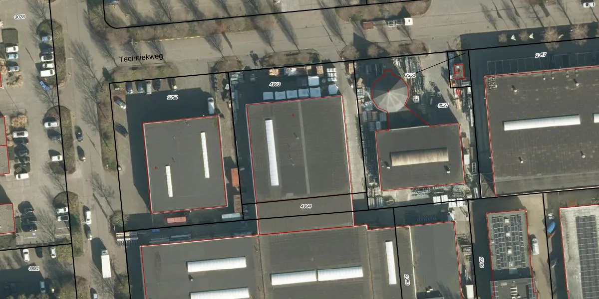Het perceel waarop Techniekweg 4 staat heeft een oppervlakte van 1873 m². Dit is een zeer groot perceel. De perceeloppervlakte wordt geregistreerd door het Kadaster. Gedetailleerde informatie over de maten van dit perceel kunt u vinden in het rapport Kadastrale kaart met maatvoering van Techniekweg 4.