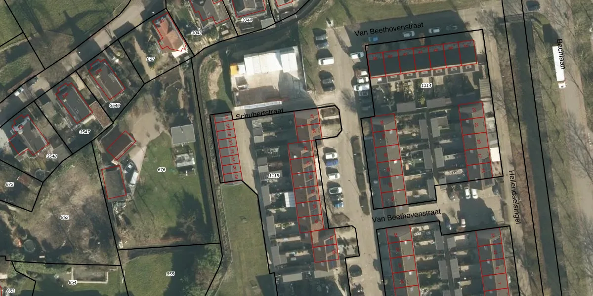 Het perceel waarop Van Beethovenstraat 43 staat heeft een oppervlakte van 2158 m². Dit is een zeer groot perceel. De perceeloppervlakte wordt geregistreerd door het Kadaster. Gedetailleerde informatie over de maten van dit perceel kunt u vinden in het rapport Kadastrale kaart met maatvoering van Van Beethovenstraat 43.