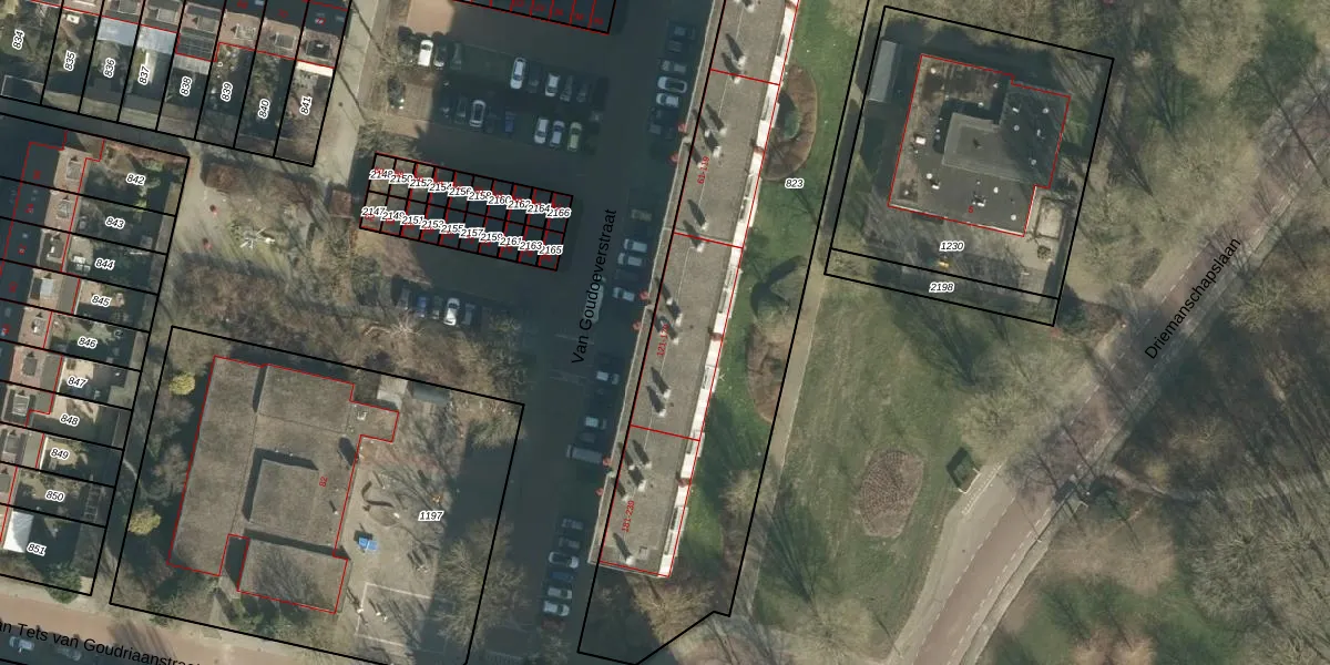 Het perceel waarop Van Goudoeverstraat 131 staat heeft een oppervlakte van 2627 m². Dit is een zeer groot perceel. De perceeloppervlakte wordt geregistreerd door het Kadaster. Gedetailleerde informatie over de maten van dit perceel kunt u vinden in het rapport Kadastrale kaart met maatvoering van Van Goudoeverstraat 131.