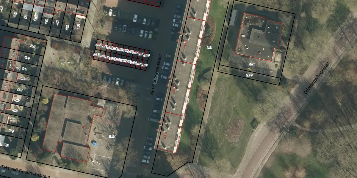 Het perceel waarop Van Goudoeverstraat 133 staat heeft een oppervlakte van 2627 m². Dit is een zeer groot perceel. De perceeloppervlakte wordt geregistreerd door het Kadaster. Gedetailleerde informatie over de maten van dit perceel kunt u vinden in het rapport Kadastrale kaart met maatvoering van Van Goudoeverstraat 133.