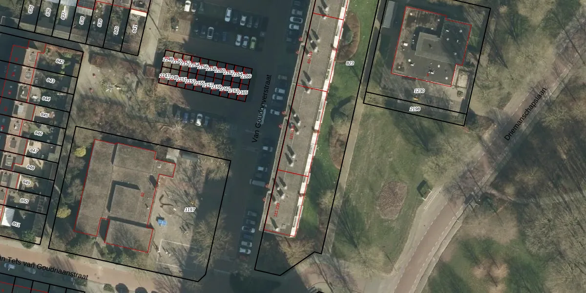 Het perceel waarop Van Goudoeverstraat 139 staat heeft een oppervlakte van 2627 m². Dit is een zeer groot perceel. De perceeloppervlakte wordt geregistreerd door het Kadaster. Gedetailleerde informatie over de maten van dit perceel kunt u vinden in het rapport Kadastrale kaart met maatvoering van Van Goudoeverstraat 139.