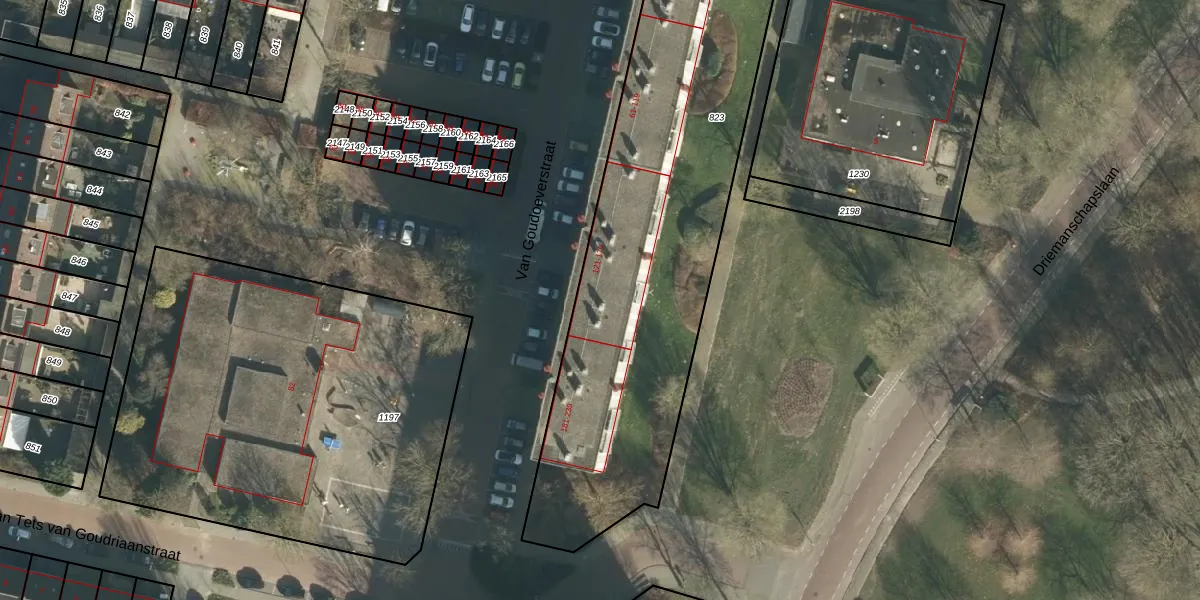 Het perceel waarop Van Goudoeverstraat 157 staat heeft een oppervlakte van 2627 m². Dit is een zeer groot perceel. De perceeloppervlakte wordt geregistreerd door het Kadaster. Gedetailleerde informatie over de maten van dit perceel kunt u vinden in het rapport Kadastrale kaart met maatvoering van Van Goudoeverstraat 157.