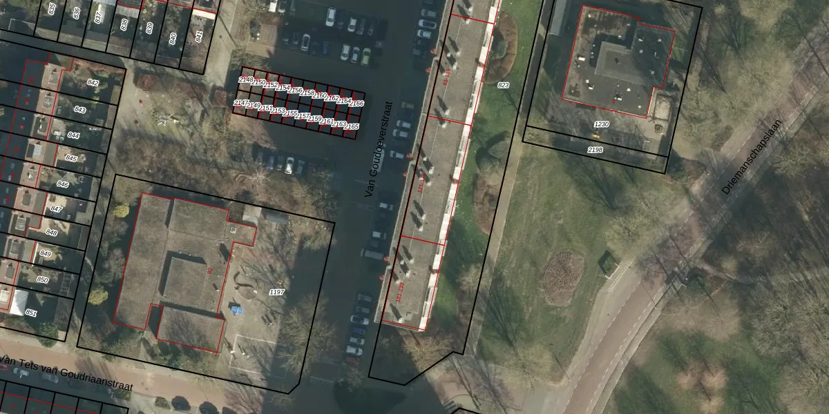 Het perceel waarop Van Goudoeverstraat 159 staat heeft een oppervlakte van 2627 m². Dit is een zeer groot perceel. De perceeloppervlakte wordt geregistreerd door het Kadaster. Gedetailleerde informatie over de maten van dit perceel kunt u vinden in het rapport Kadastrale kaart met maatvoering van Van Goudoeverstraat 159.