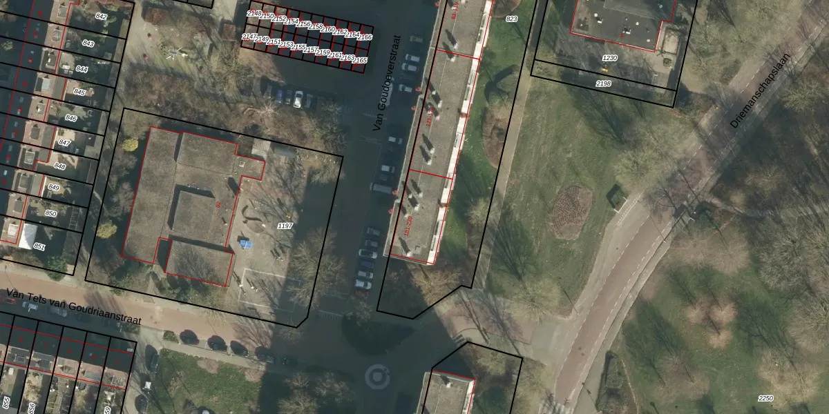 Het perceel waarop Van Goudoeverstraat 181 staat heeft een oppervlakte van 2627 m². Dit is een zeer groot perceel. De perceeloppervlakte wordt geregistreerd door het Kadaster. Gedetailleerde informatie over de maten van dit perceel kunt u vinden in het rapport Kadastrale kaart met maatvoering van Van Goudoeverstraat 181.