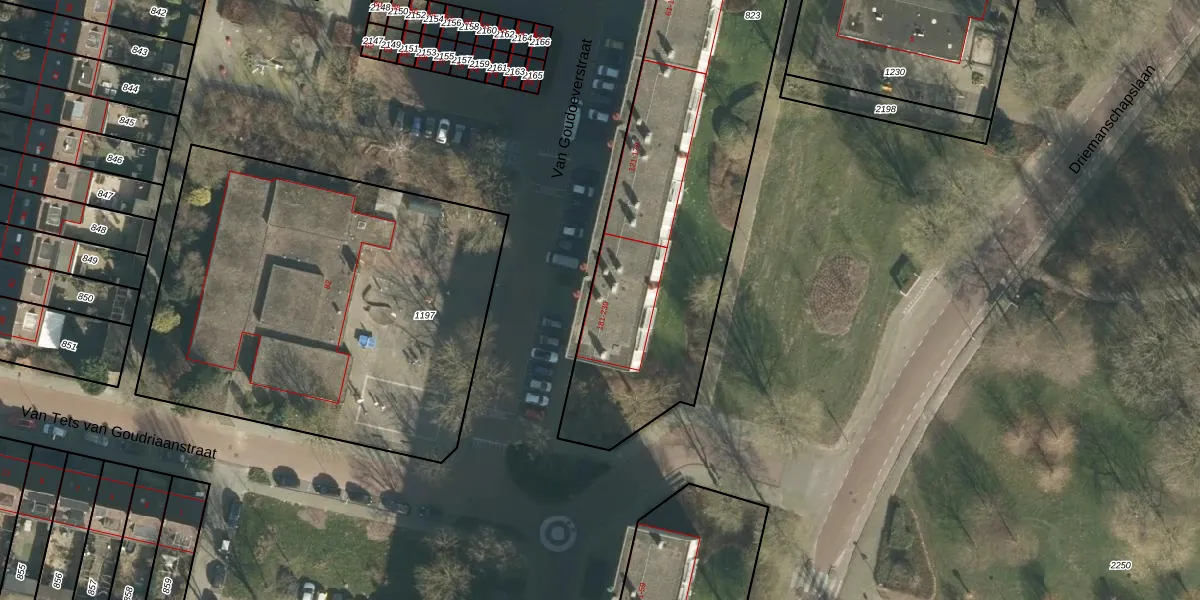 Het perceel waarop Van Goudoeverstraat 191 staat heeft een oppervlakte van 2627 m². Dit is een zeer groot perceel. De perceeloppervlakte wordt geregistreerd door het Kadaster. Gedetailleerde informatie over de maten van dit perceel kunt u vinden in het rapport Kadastrale kaart met maatvoering van Van Goudoeverstraat 191.