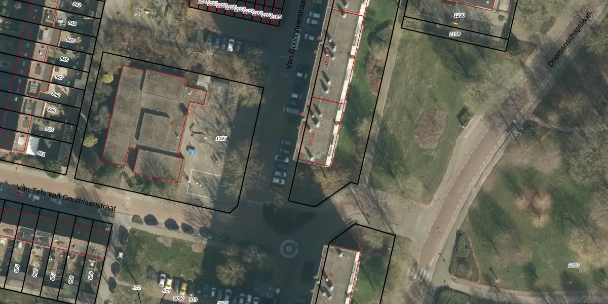 Het perceel waarop Van Goudoeverstraat 217 staat heeft een oppervlakte van 2627 m². Dit is een zeer groot perceel. De perceeloppervlakte wordt geregistreerd door het Kadaster. Gedetailleerde informatie over de maten van dit perceel kunt u vinden in het rapport Kadastrale kaart met maatvoering van Van Goudoeverstraat 217.