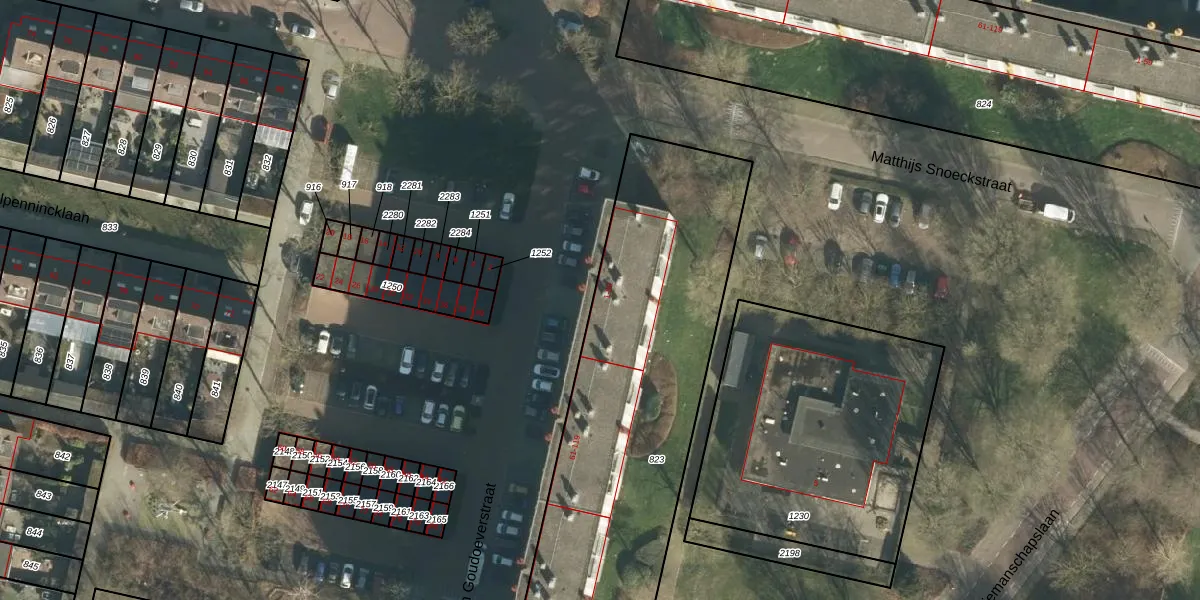 Het perceel waarop Van Goudoeverstraat 39 staat heeft een oppervlakte van 2627 m². Dit is een zeer groot perceel. De perceeloppervlakte wordt geregistreerd door het Kadaster. Gedetailleerde informatie over de maten van dit perceel kunt u vinden in het rapport Kadastrale kaart met maatvoering van Van Goudoeverstraat 39.