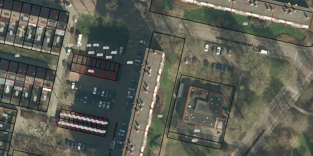 Het perceel waarop Van Goudoeverstraat 55 staat heeft een oppervlakte van 2627 m². Dit is een zeer groot perceel. De perceeloppervlakte wordt geregistreerd door het Kadaster. Gedetailleerde informatie over de maten van dit perceel kunt u vinden in het rapport Kadastrale kaart met maatvoering van Van Goudoeverstraat 55.