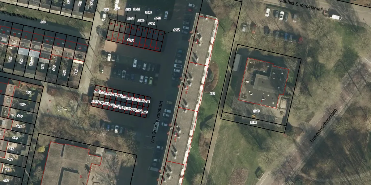 Het perceel waarop Van Goudoeverstraat 63 staat heeft een oppervlakte van 2627 m². Dit is een zeer groot perceel. De perceeloppervlakte wordt geregistreerd door het Kadaster. Gedetailleerde informatie over de maten van dit perceel kunt u vinden in het rapport Kadastrale kaart met maatvoering van Van Goudoeverstraat 63.