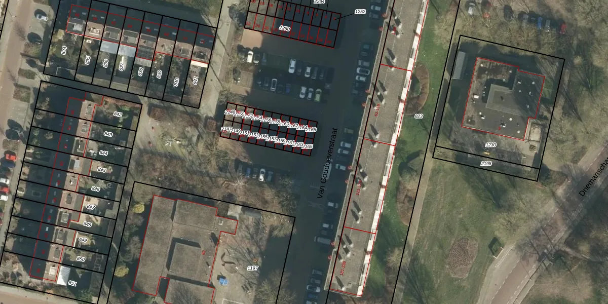 Het perceel waarop Van Goudoeverstraat 80 staat heeft een oppervlakte van 18 m². Dit is een klein perceel. De perceeloppervlakte wordt geregistreerd door het Kadaster. Gedetailleerde informatie over de maten van dit perceel kunt u vinden in het rapport Kadastrale kaart met maatvoering van Van Goudoeverstraat 80.