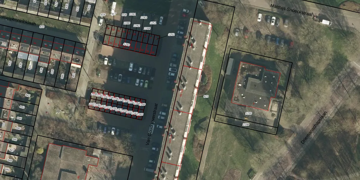 Het perceel waarop Van Goudoeverstraat 83 staat heeft een oppervlakte van 2627 m². Dit is een zeer groot perceel. De perceeloppervlakte wordt geregistreerd door het Kadaster. Gedetailleerde informatie over de maten van dit perceel kunt u vinden in het rapport Kadastrale kaart met maatvoering van Van Goudoeverstraat 83.