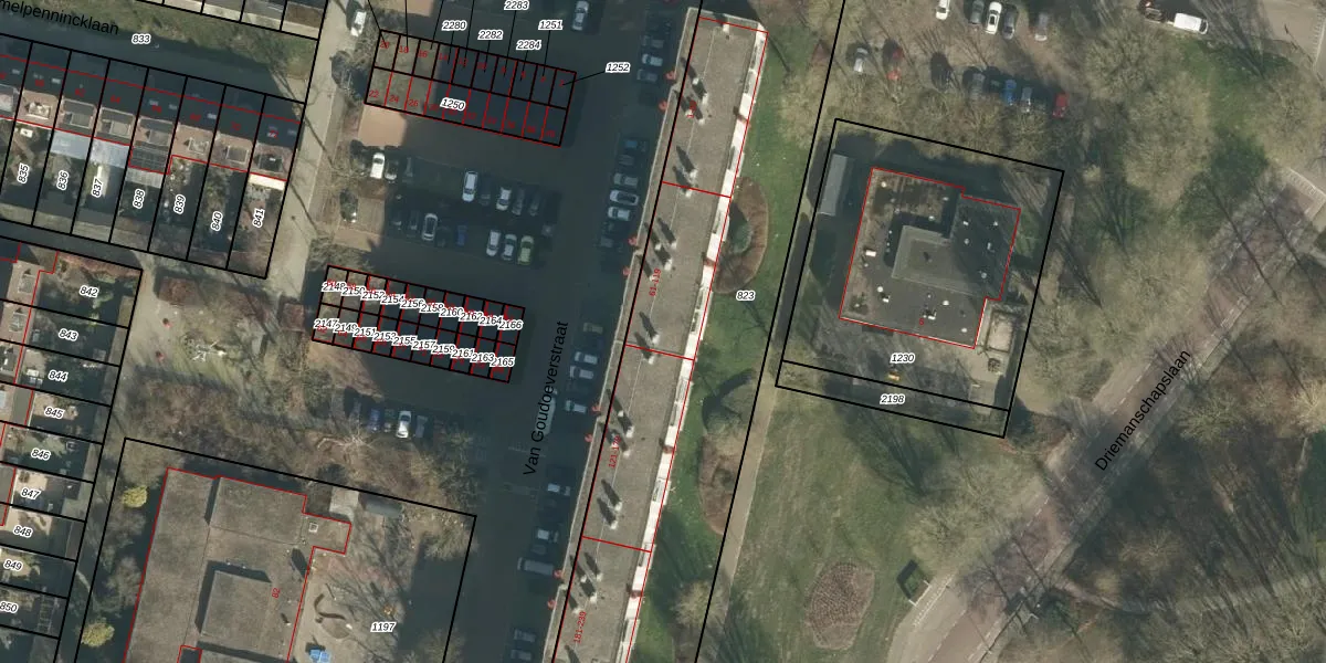 Het perceel waarop Van Goudoeverstraat 93 staat heeft een oppervlakte van 2627 m². Dit is een zeer groot perceel. De perceeloppervlakte wordt geregistreerd door het Kadaster. Gedetailleerde informatie over de maten van dit perceel kunt u vinden in het rapport Kadastrale kaart met maatvoering van Van Goudoeverstraat 93.